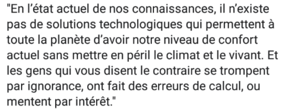 La seule manière d’affronter le changement climatique c’est de produire et consommer moins. Quoi qu’on nous raconte, quelles que soient les découvertes hightech qu’on agite devant nos yeux, il y a une équation qui ne changera jamais : produire….. c’est polluer.